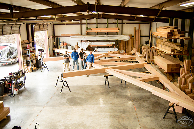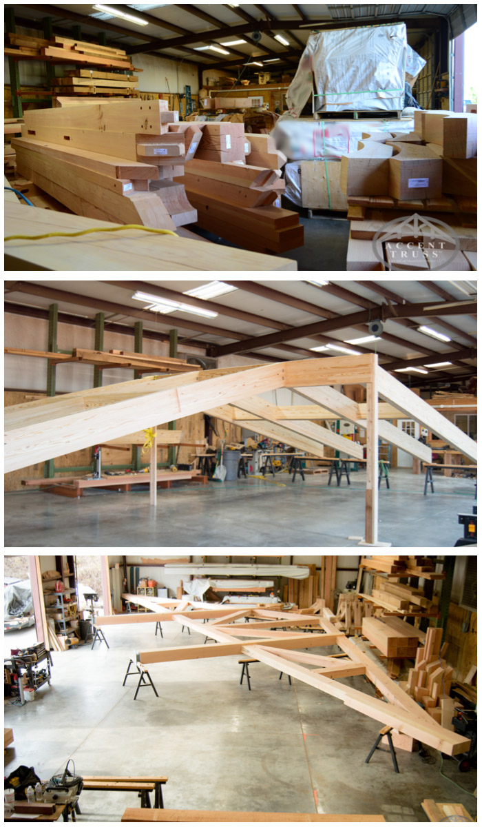 We can’t do what we do without the best timber we can find! It’s not uncommon to see the shop full of pieces both already cut and waiting their turn to be crafted into something great. Watching those stacks transform into trusses and accents like the two above is a very fun part of the job!
