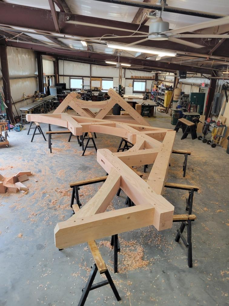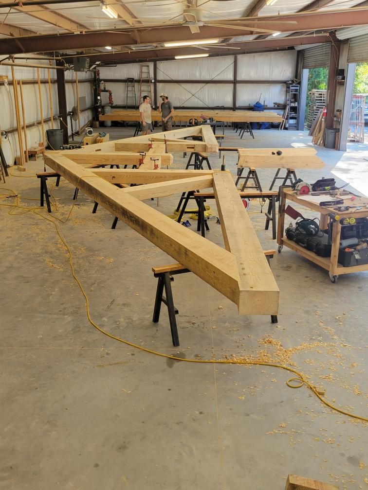 Happenings Around The Shop We have been working on an exciting new project recently in the shop! This Douglas fir timber frame was just completed for a large barndominium in Arkansas. It is currently being installed, and we look forward to seeing the final home completed. </