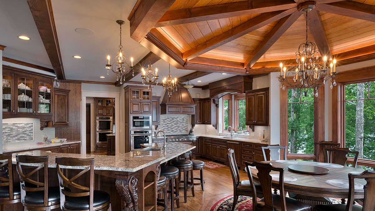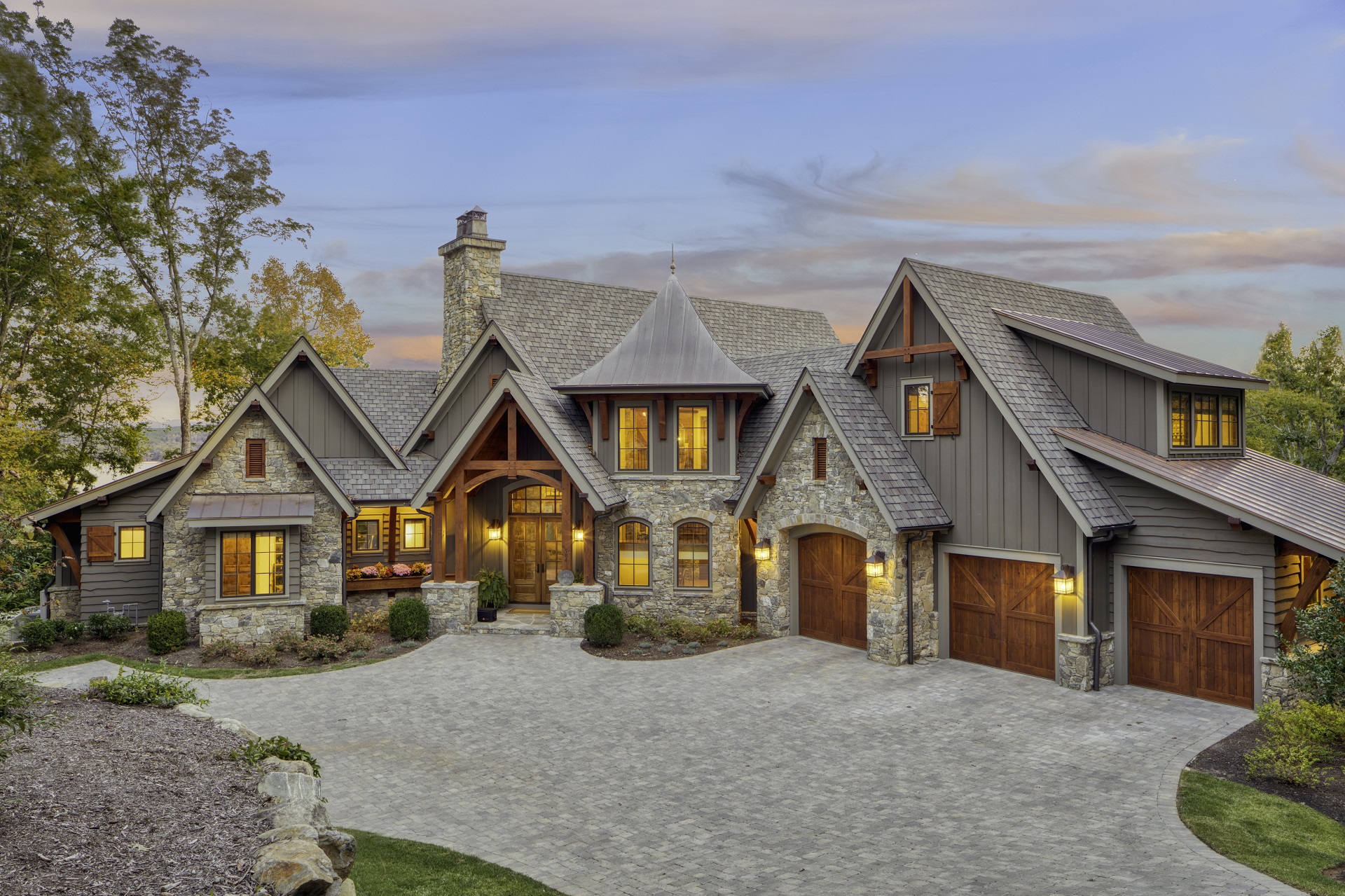 Our trusses and timber elements look so fantastic in this gorgeous and distinctive Garrell Associates, Inc. Tranquility plan built by the terrific and talented Peppers Construction. Timber is hand-scraped Douglas-Fir