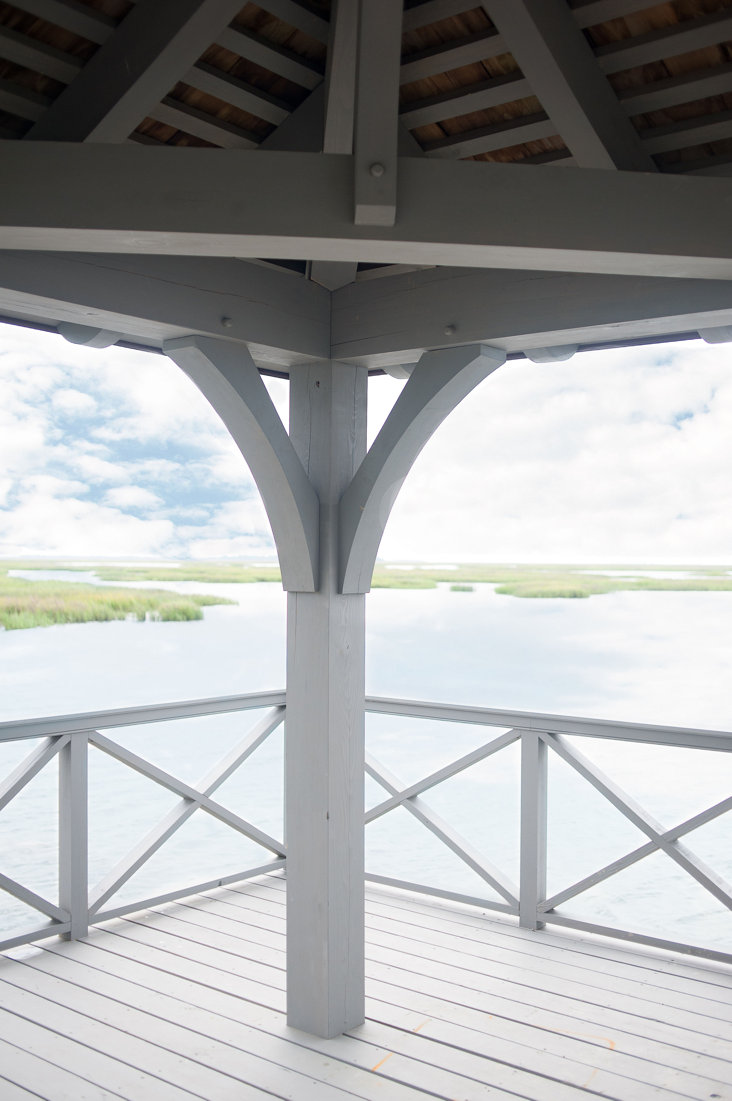 - Timber Frame Details: The frame boasts a curved hip roof on all 4 sides with the curved hip rafters being carried by diagonal dragon braces at each corner. On top of the hip and jack rafters there are 2″ purlins that support the cedar shingle roofing, which is exposed from the underside. Mortise and tenon joinery along with concealed steel work together to meet the high wind loading for the area.